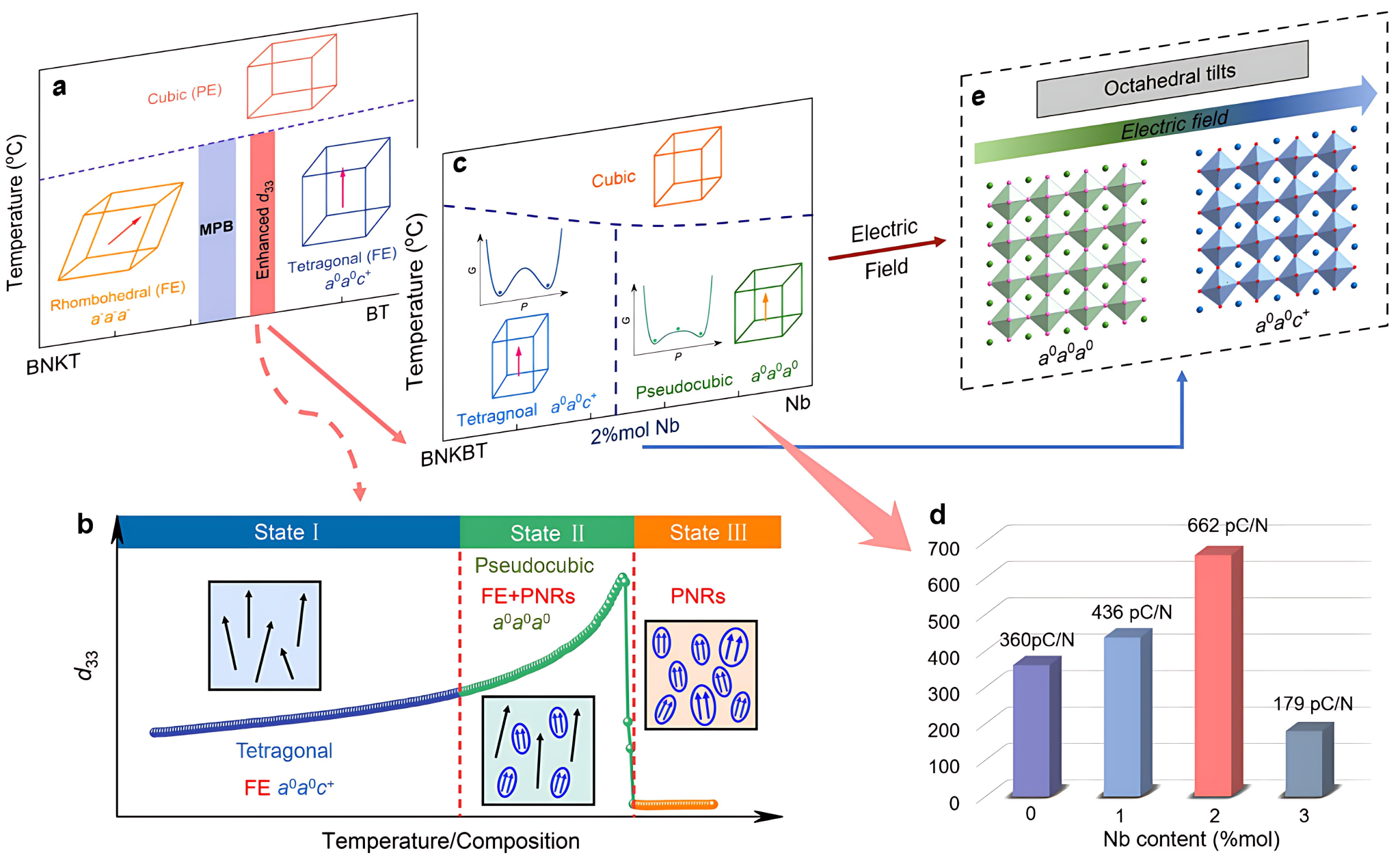 近日,我们wedvictor伟德魏永星副教授研究团队联合西安交通大学靳立教授、俄罗斯圣彼得堡彼得大帝理工大学Roman G. Burkovsky副教授在国际顶级学术期刊《Advanced Powder Materials》(IF=24.9)上发表了题为“Tetragonal-pseudocubic phase boundaries and octahedral order-disorder tilting transitions facilitate high piezoelectric performance in Bi1/2Na1/2TiO3-based single crystals”学术论文,我们为第一通讯单位,2024级博士研究生牛佳林为论文的第一作者。