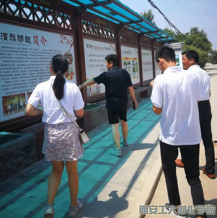 在找到渭旗村支书的联系方式后,我们赶往渭旗村。经过了半个小时的车程后,队员们到达了渭旗村。在等待村支书的过程中,留意到了村委会大楼上的八个大字“文化礼堂,精神家园”。村委会对面有一个壮观的渭旗村大舞台,看起来有近期表演的样子。当从村民口中了解到有一年近九十的老人,正是上一辈渭旗锣鼓传承人。如今老人早已经不再参加表演,队员们决定先去拜访一下老人。队员们很快来到了老人家里。老人见队员们来询问有关渭旗锣鼓的事情,混浊的双眼中开始微微泛光。在与老人的交谈中我们得知,渭旗锣鼓早从春秋战国时期就开始发展,而老人也是从小就精通渭旗锣鼓的多种技巧。之后,队员们采访了渭旗锣鼓传承人兼负责人渭旗村支书。支书带着队员们一行人参观了渭旗锣鼓活动室,看着满墙的牌匾以及荣誉证书,队员们不禁叹服。