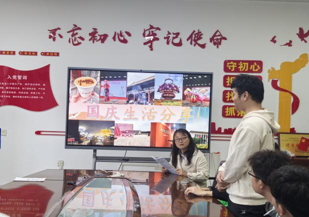 会议伊始,党支部书记张瑞红老师带领全体成员通过视频短片回顾了新中国在工业制造、科技创新等领域的发展成就,重点聚焦材料与化工行业对国家经济建设的支撑作用。期间,两位党员给大家讲述了自己在国庆期间的经历,通过自己在国庆期间的所见所闻抒发了对祖国大好河山以及人民日益美好生活的感叹,表达了自己的自豪与激动。